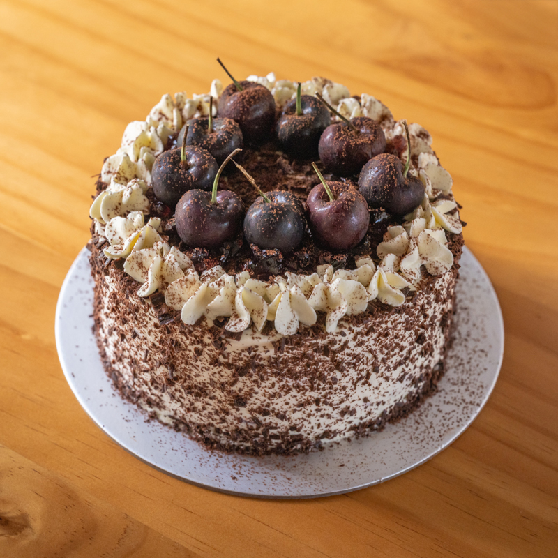 A rich and elegant chocolate cake with tart cherries and a sophisticated blend of chocolate and cocoa. Indulgent, moist, and topped with creamy frosting.
